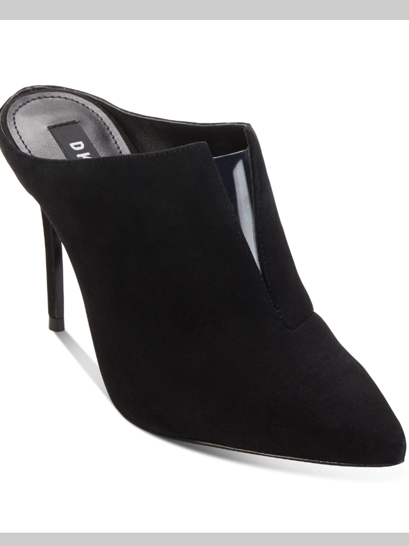 A clearly cool look with a see-through inset front and center, DKNY's Dacey mules bring stylish edge to any look.