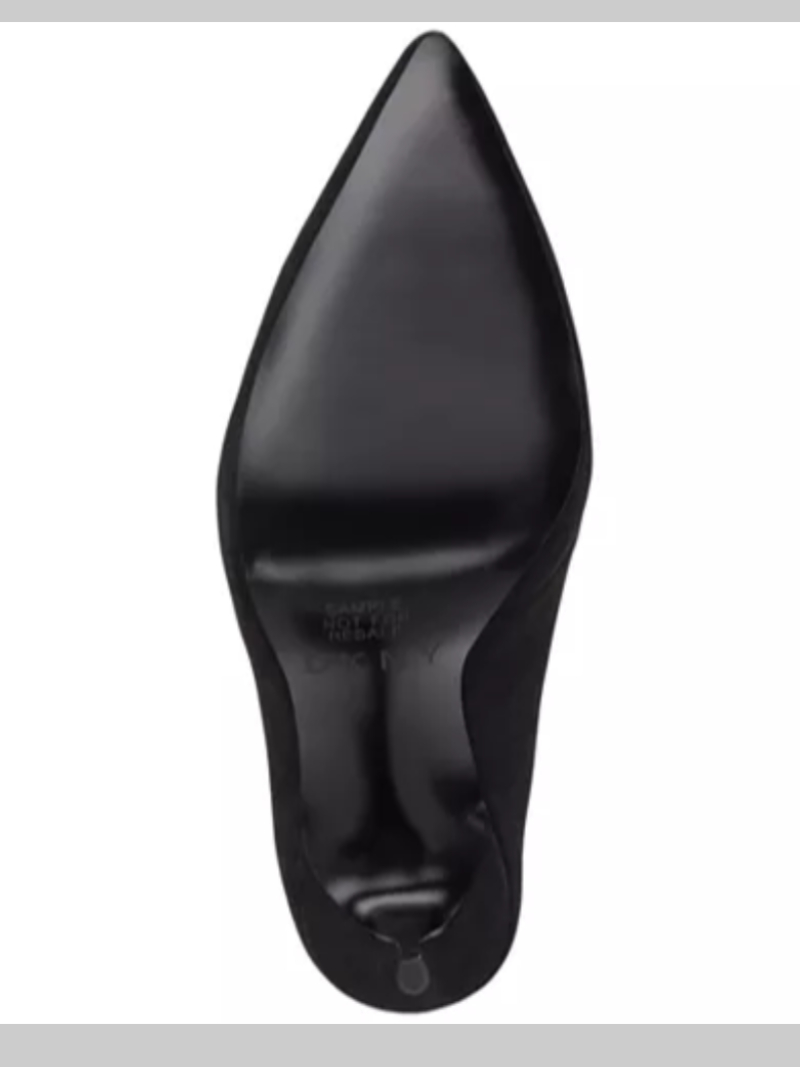 Style | Pointed-toe slip-on mule pumps V-notch cutout at vamp with translucent inset; metallic heel rand |