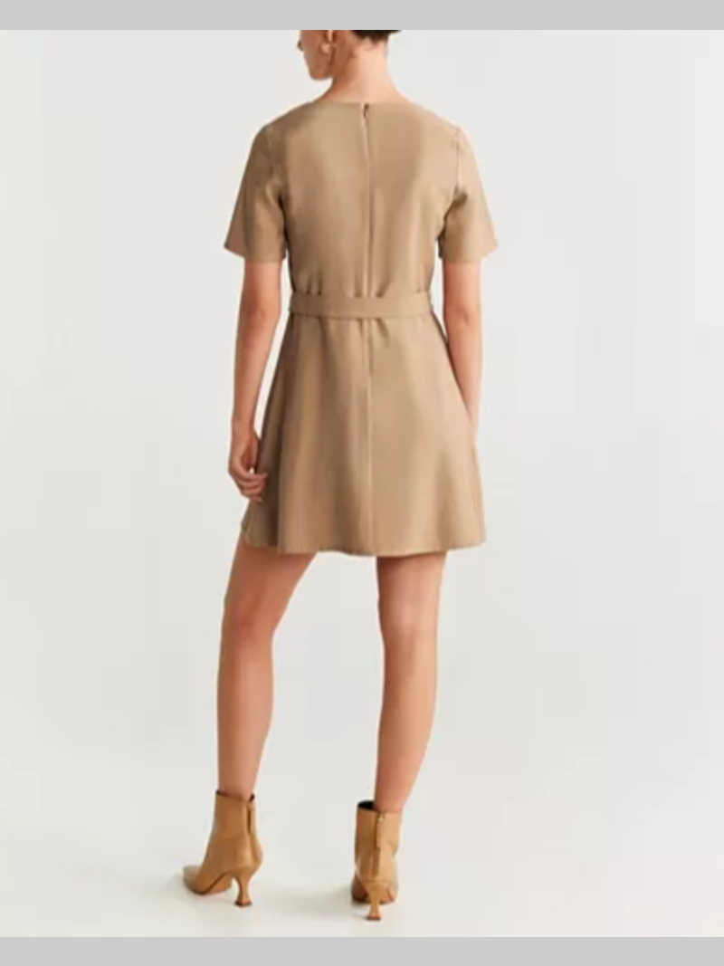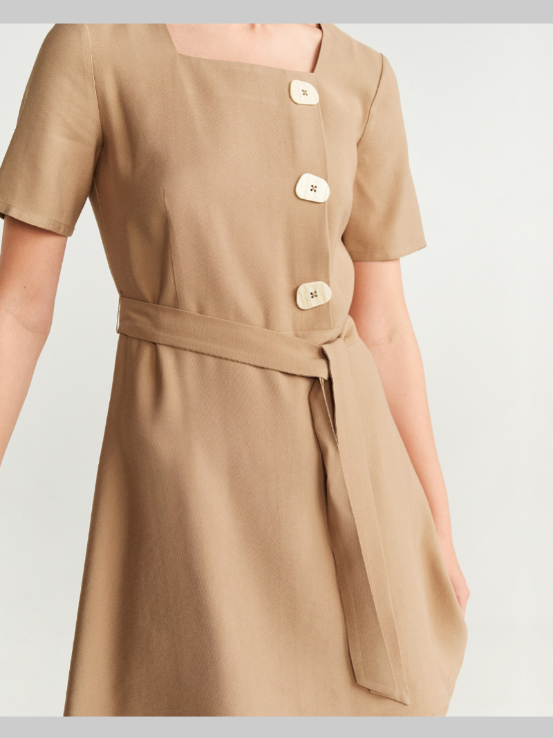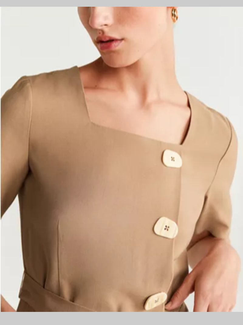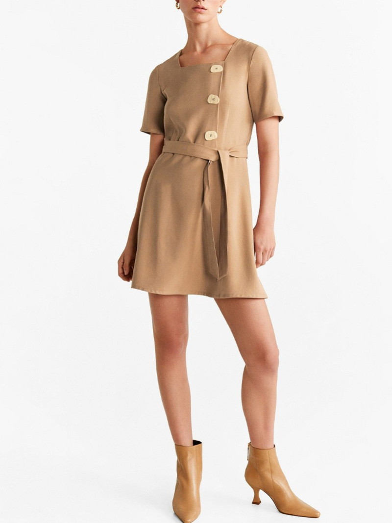 Look stylish and chic in this short and flared unique Mango dress. It comes with fancy buttons on the front, square neck, short sleeves and back zip with adjustable belt.