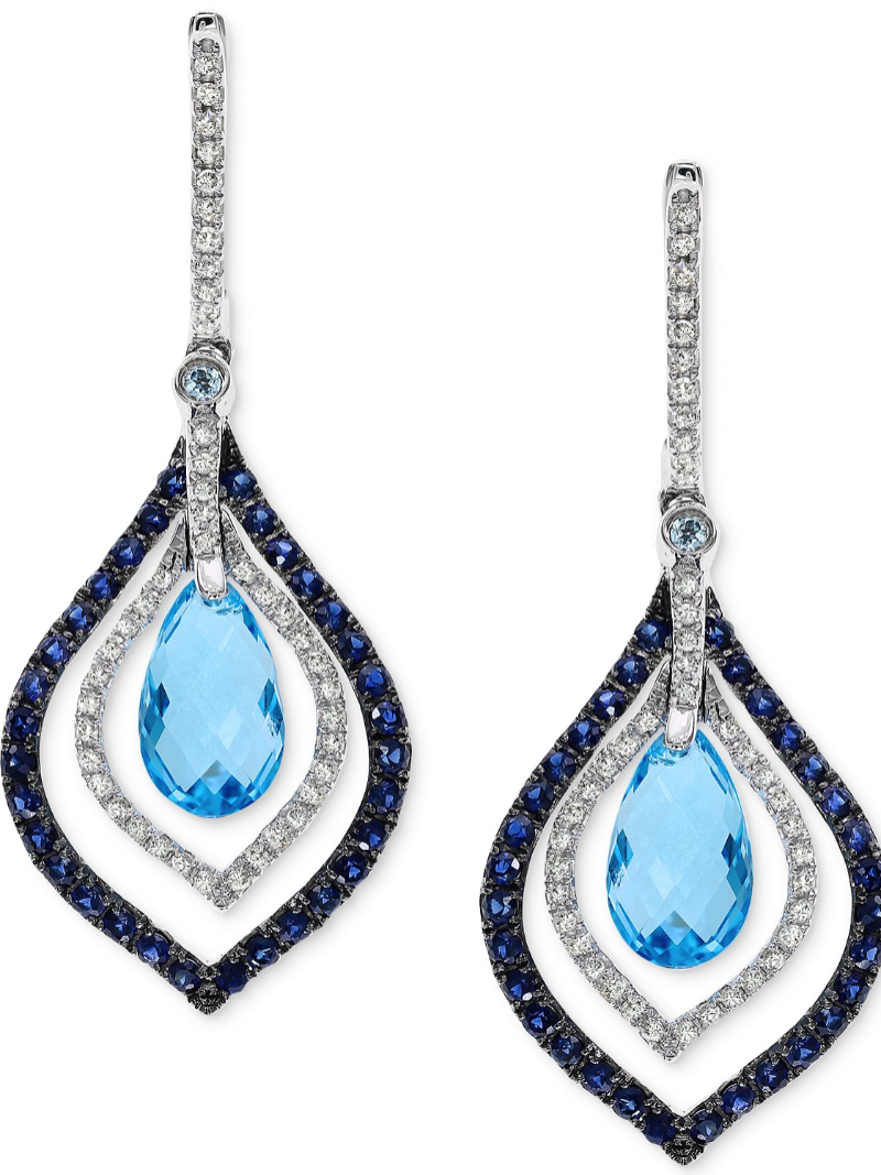 Dress to the nines with these stunning earrings from EFFY. Featuring oval-cut blue topaz (3-3/4 ct. t.w.) framed with round-cut sapphire (3/4 ct. t.w.) and diamonds (1/3 ct. t.w.). Crafted in 14k white gold. Approximate drop: 1-1/3 inches.