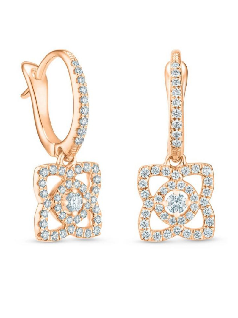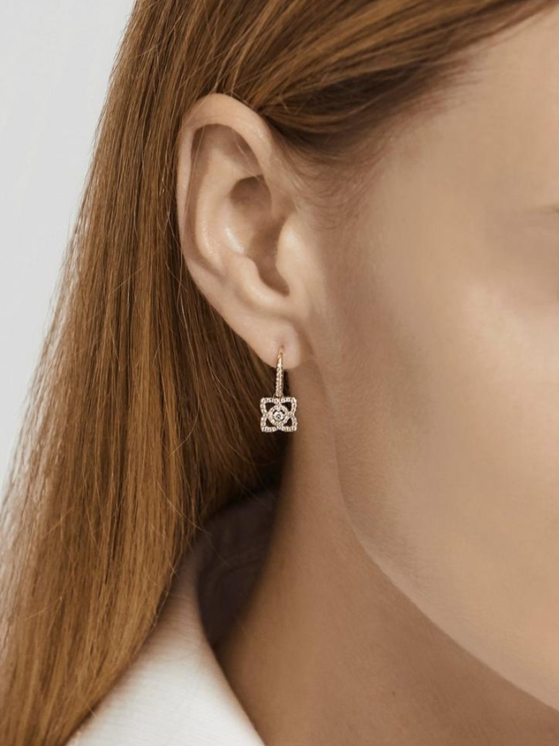 The lotus flower has long been a symbol of purity. In this elegant pair of diamond earrings, it is captured forever in delicate threads of micropavé set in 18K rose gold. Four petals radiate out from the central round brilliant diamond, in an openwork construction which lends this piece a sense of weightlessness. This elegant composition totals 8.0 mm in height and width, and is suspended from a micropavé hoop. The total diamond weight of these earrings is ~0.35 carats, each diamond ethically sourced and meticulously set by hand. These earrings would wear beautifully alongside a necklace or bracelet from the Enchanted Lotus collection.