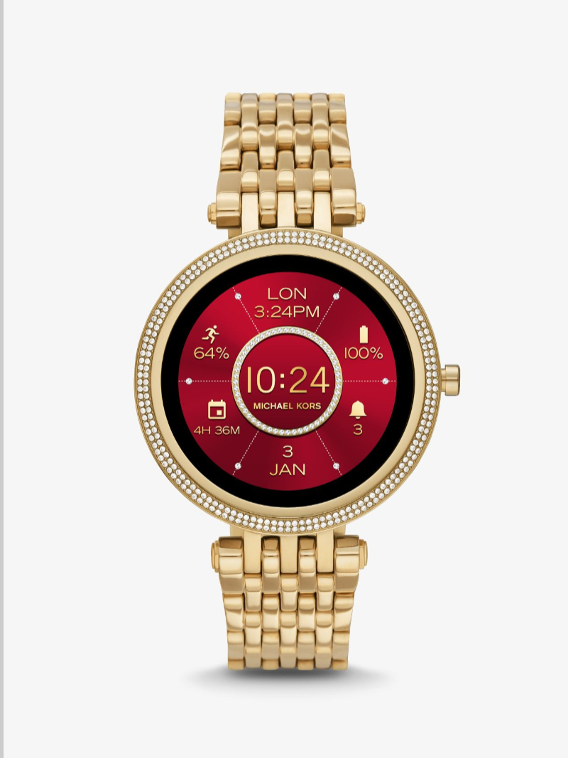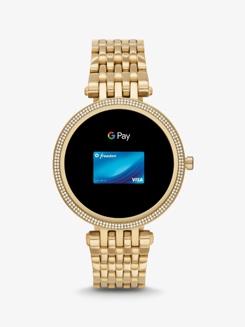 • Oversized smartwatch • Powered by Wear OS by Google™ • Compatible with iPhone® and Android™ phones • Gold-tone stainless steel • Pavé topring • Oversized • 43mm case • AMOLED Display: active-matrix organic light-emitting diode • Social media updates • Text/email alerts • App notifications • Smart help from Google • Built-in fitness tracking • Voice-activated Google assistant • Estimated heart rate tracking • Swimproof technology • Payment technology • GPS distance tracking • Display animation • Clasp fastening • Compatible with Heart Rate Smartwatch Charger • Water resistant up to 5 ATM • 2-year warranty • Imported