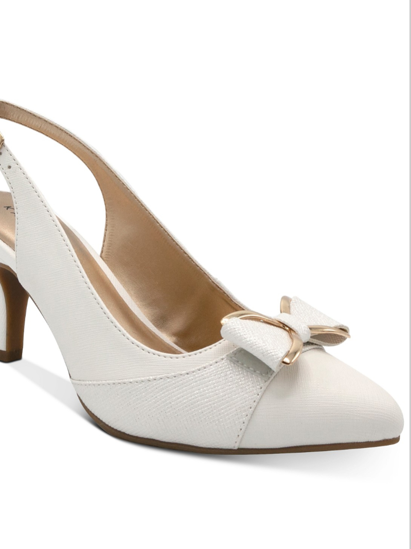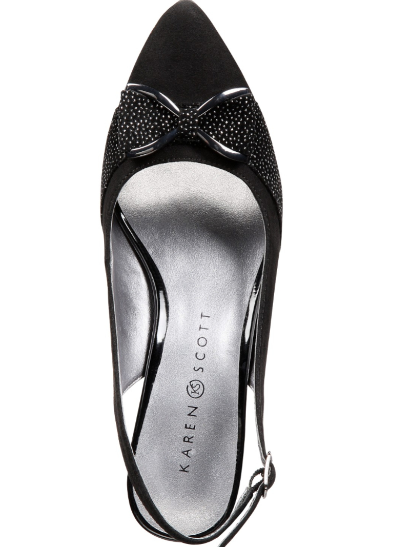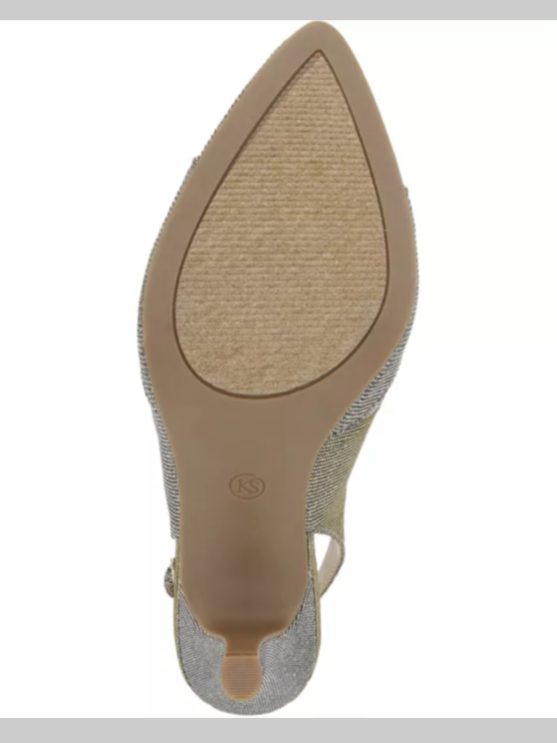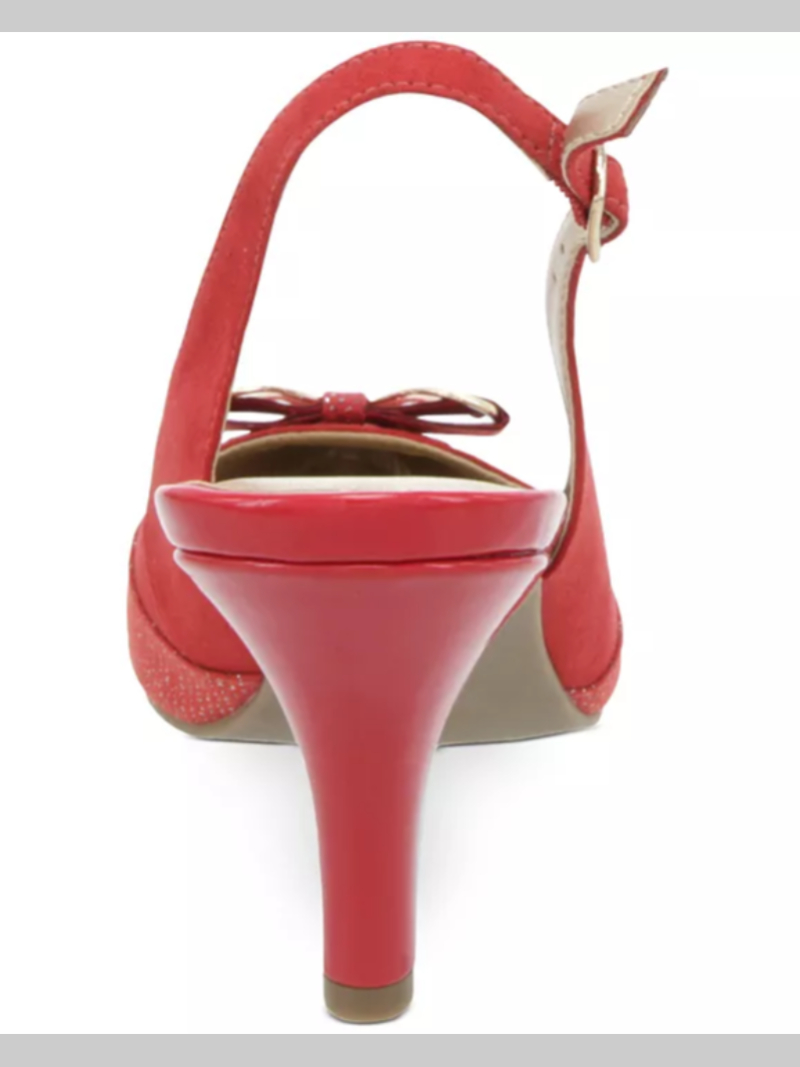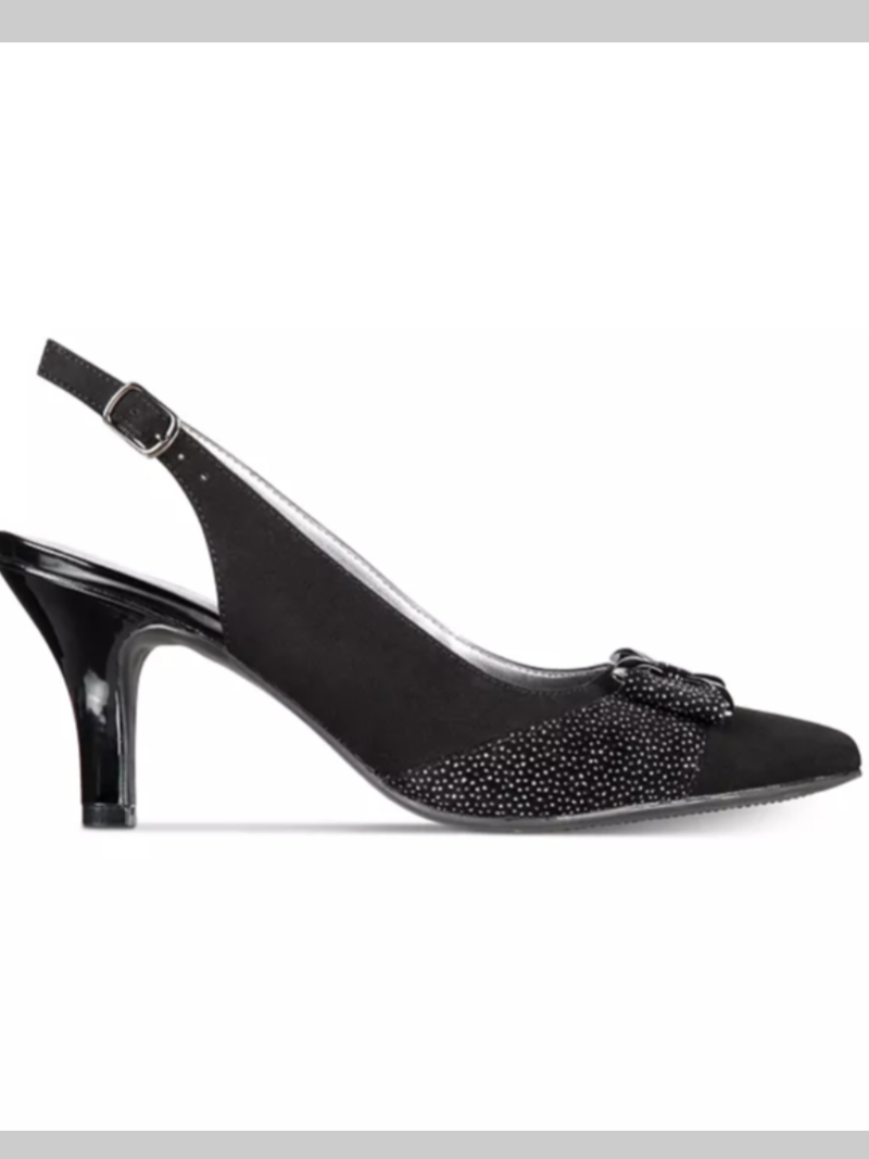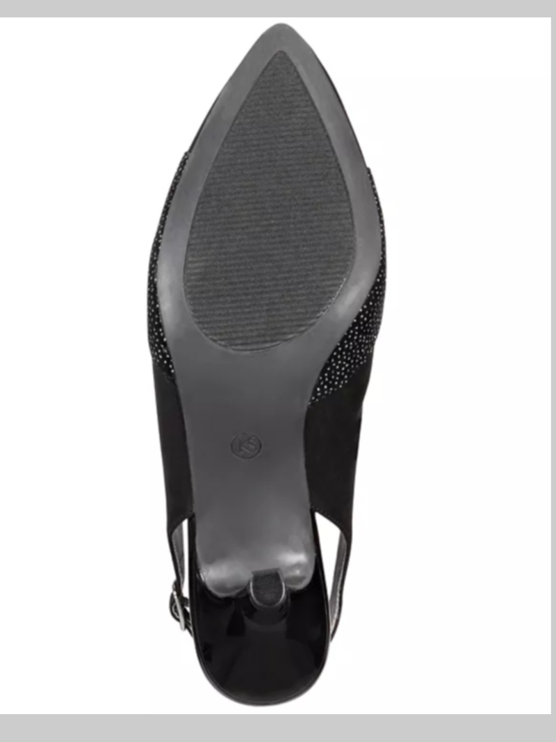 Style | Pointed-toe slip-on slingback pumps with adjustable buckle closure Bow hardware detail and rhinestone accents at toe cap Latex foam for added comfort |