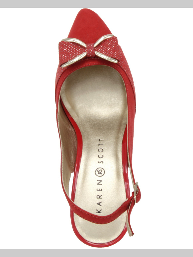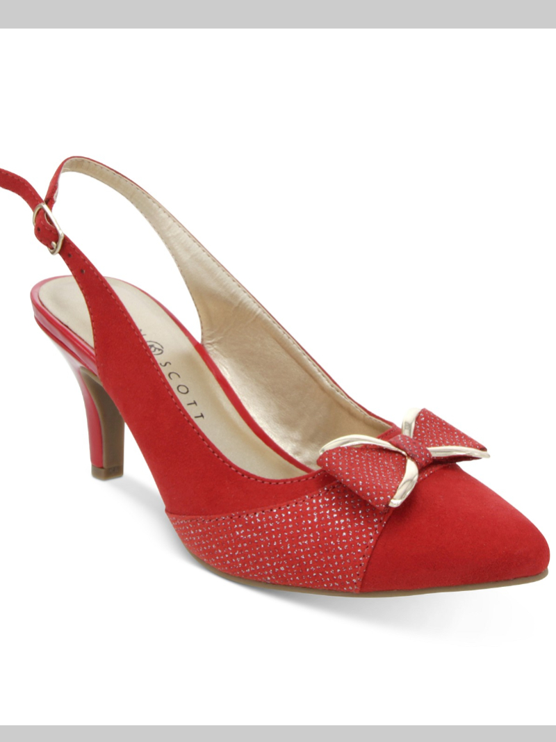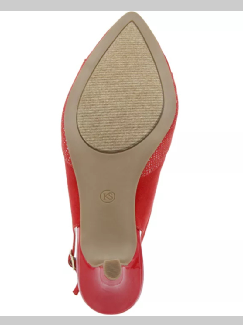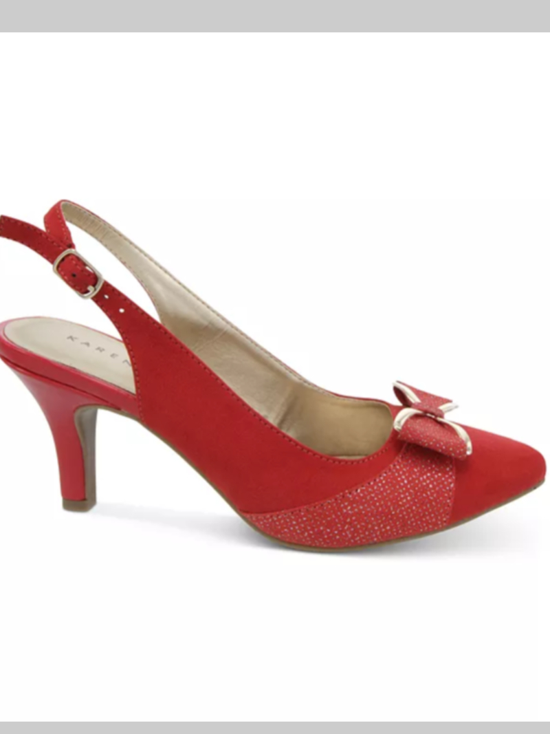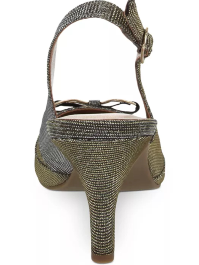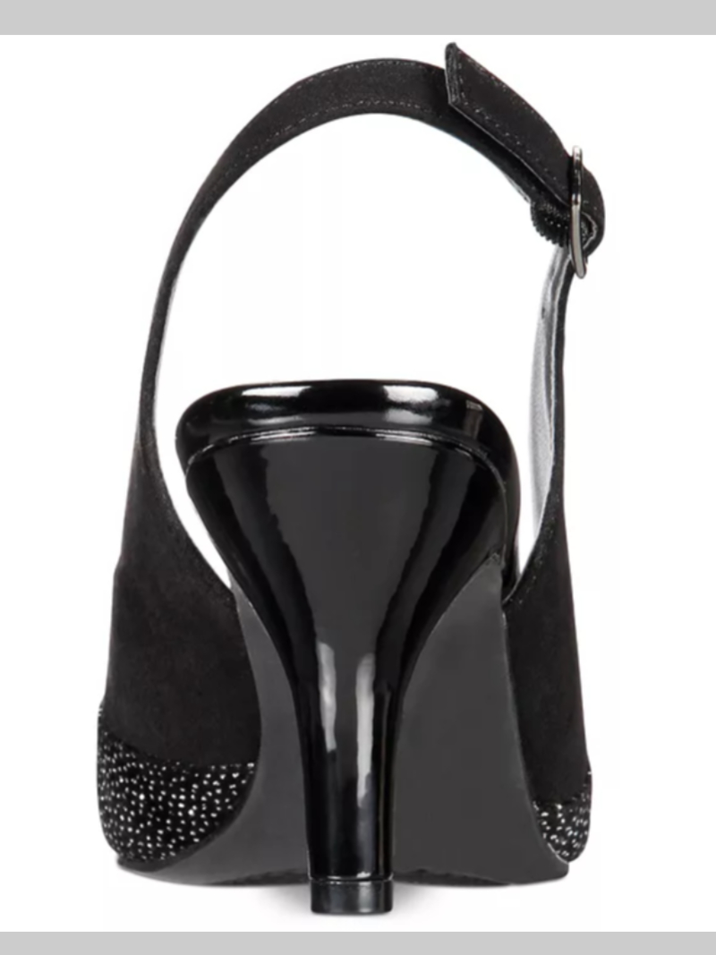 Style | Pointed-toe slip-on slingback pumps with adjustable buckle closure Bow hardware detail and rhinestone accents at toe cap Latex foam for added comfort |