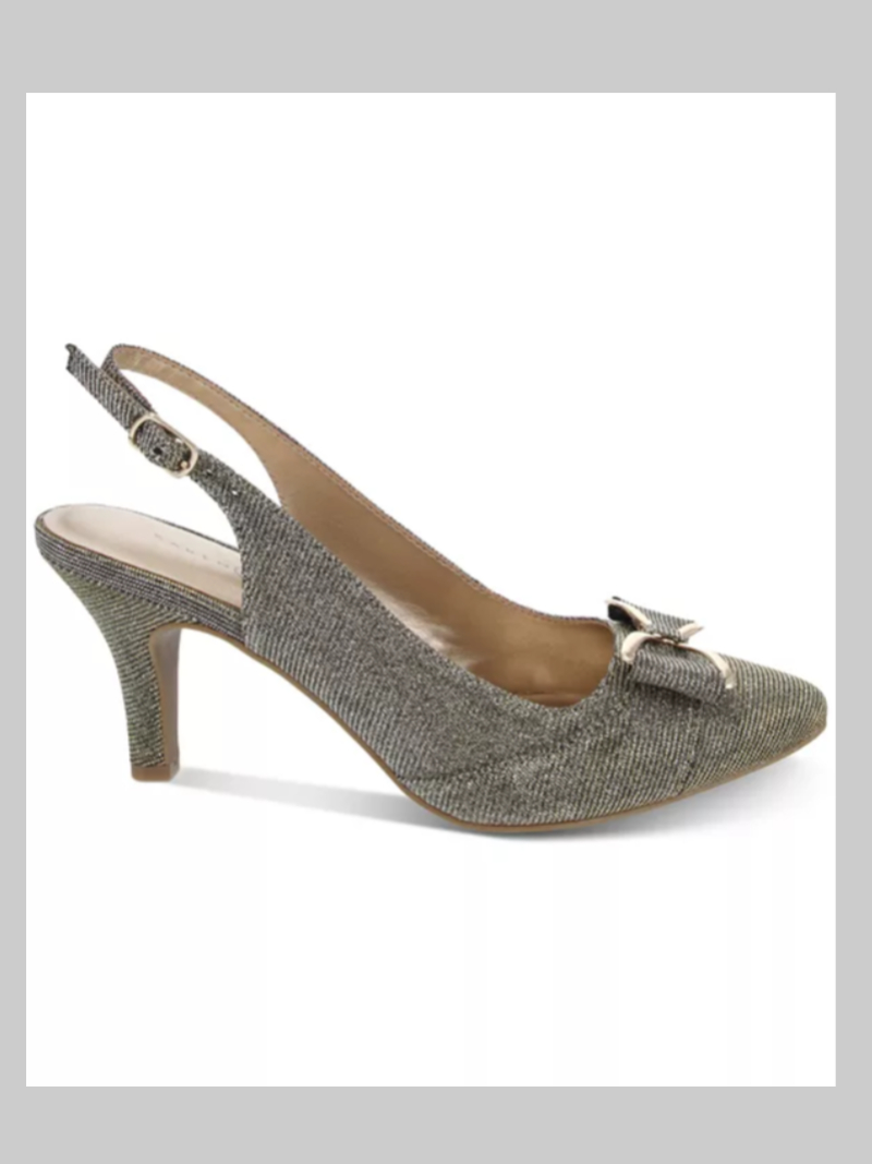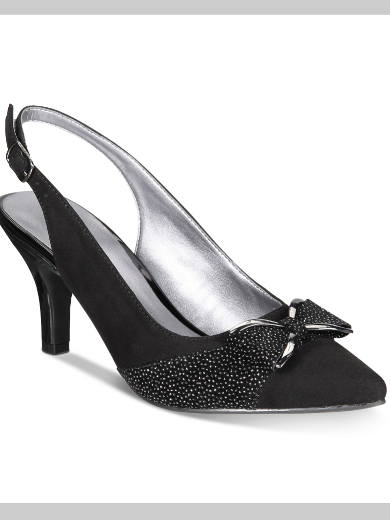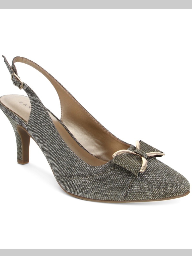 Karen Scott's Gladiss pumps add shimmer and shine to dressy looks in sparkling accents and metallic bow hardware on a sleek pointed-toe profile.