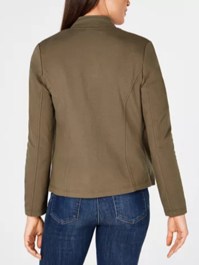 Style | Stand-up collar; open front |