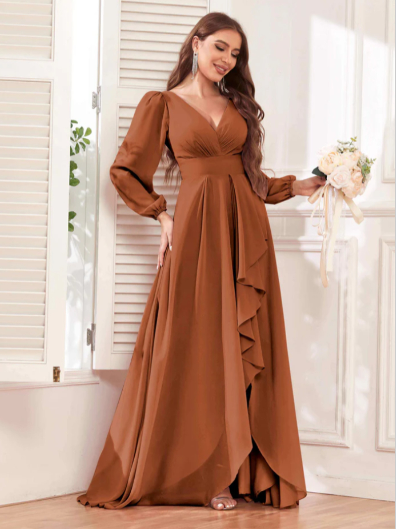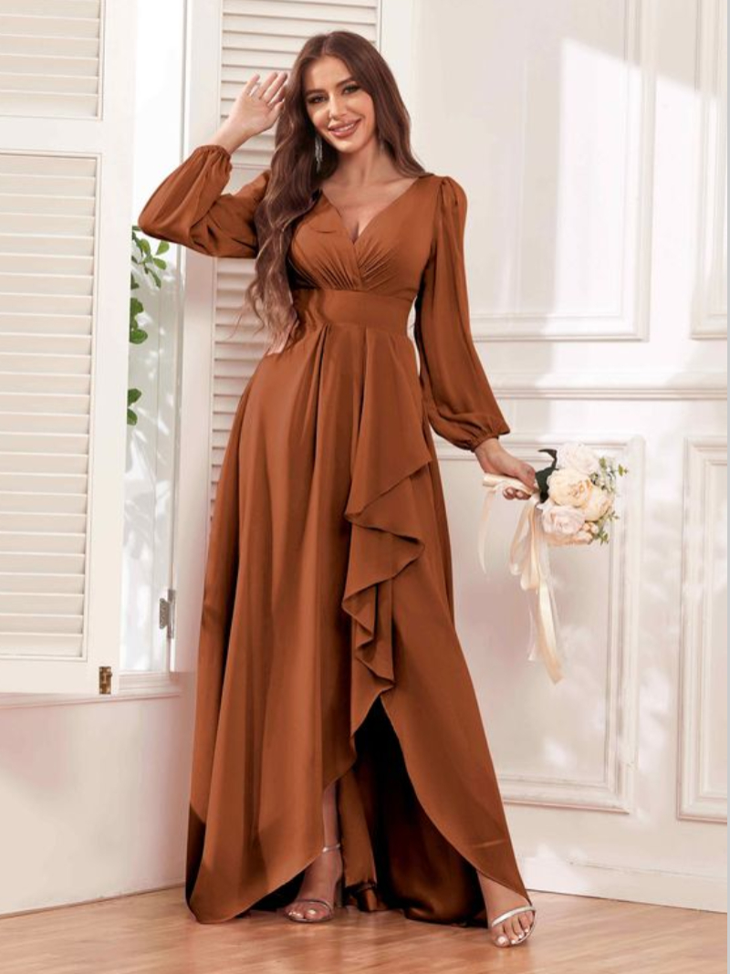 Give basic dresses the cold shoulder with this ruffled update from DKNY, cut with an elongating V-neckline in airy chiffon.
