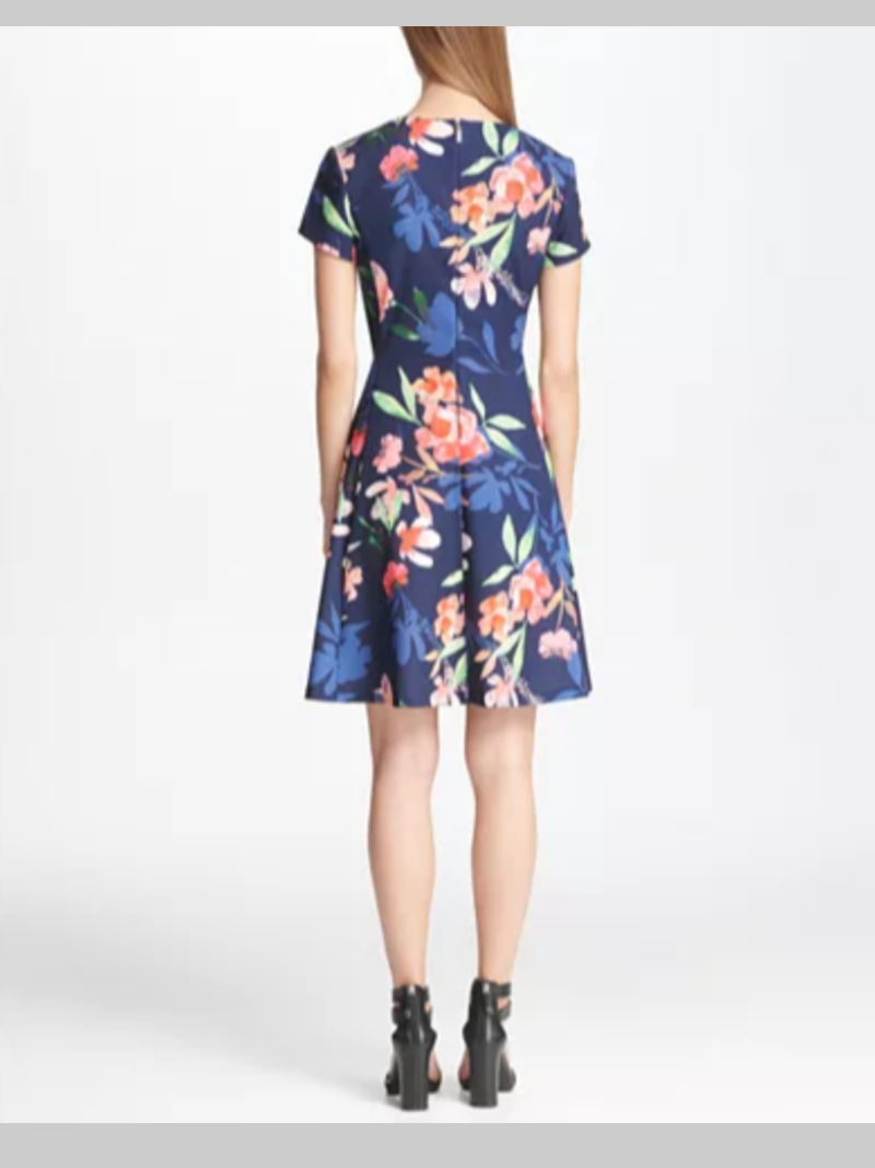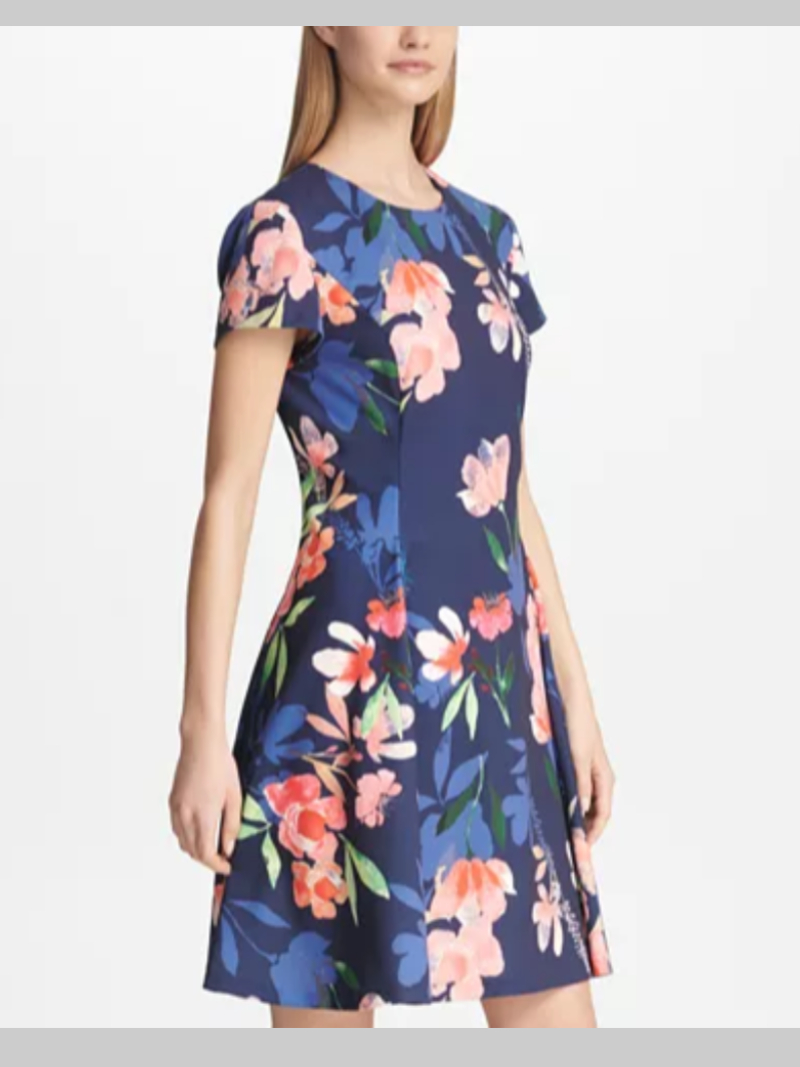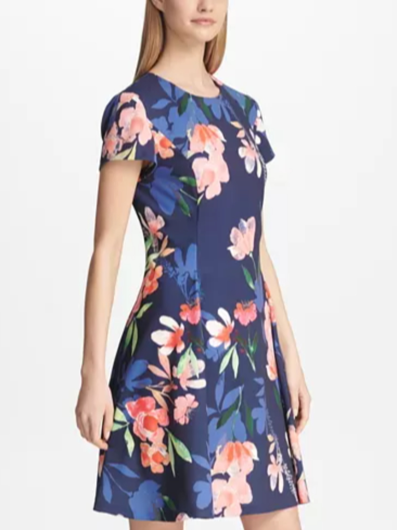 Get in on the floral trend with this short-sleeved fit-and-flare dress by DKNY, featuring an allover, printed design.