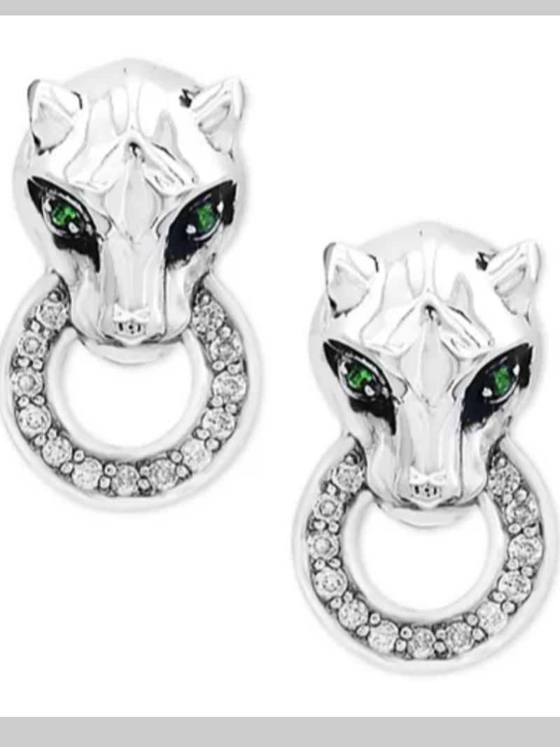 Up the wow factor with these wildly beautiful round-shape diamond (1/8 ct. t.w.) and tsavorite accent panther doorknocker drop earrings created by EFFY in sterling silver.