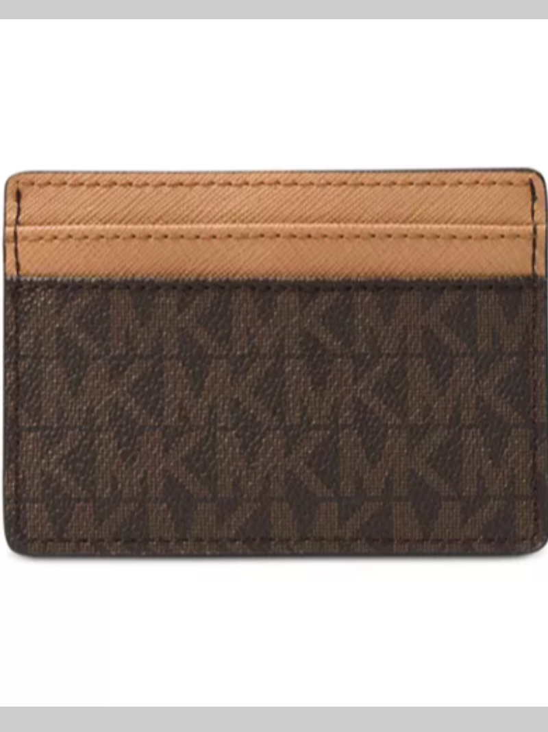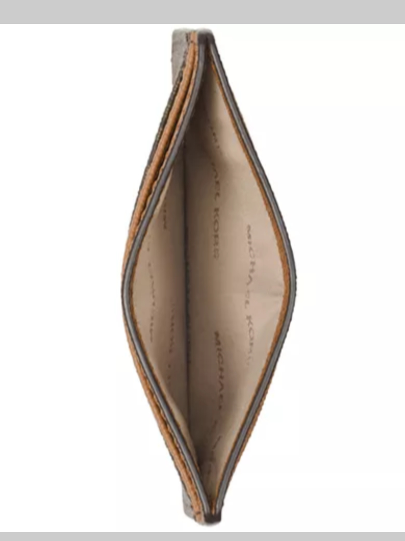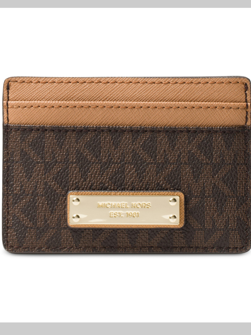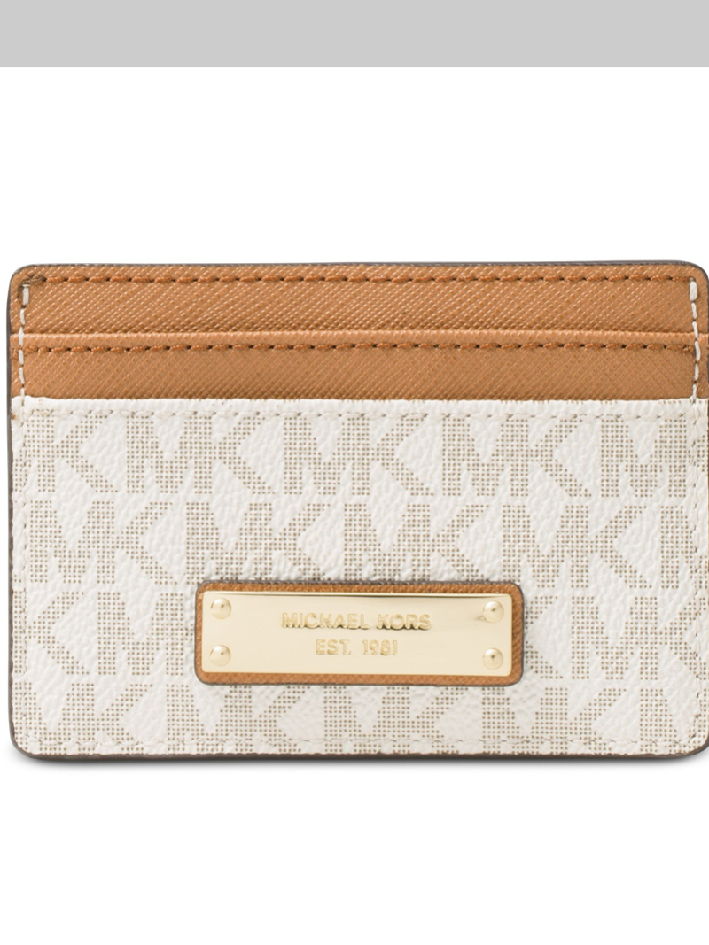 A signature print and a gleaming logo detail heighten the upscale appeal of this compact card holder from MICHAEL Michael Kors.