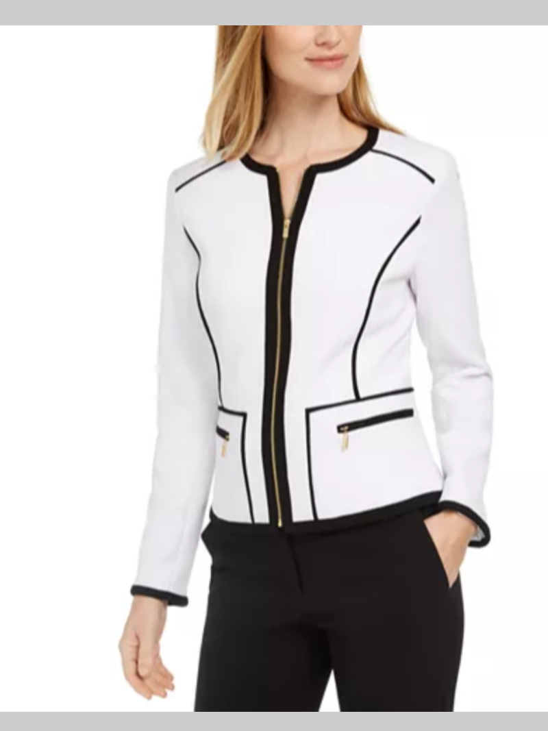 Collarless; zipper closure at front Piped detail throughout; contrast trim at placket and hem; shoulder pads Zipper pockets at hips Long sleeves with contrast trim at cuffs Lined